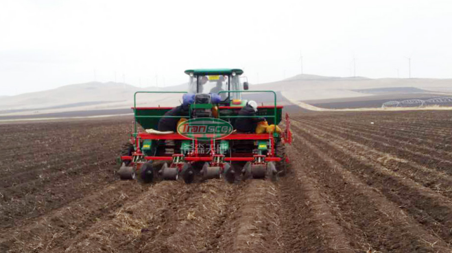 在每一组播种单元中,有一条用在它上面的振动板,这使得微型薯在能够顺利的进入待传送区域。通过传送带引导微型薯,移动向下一个与之转速相同步的压种带,从而播种在土壤中。由于微型薯向下运输,直到他们都非常接近土壤表面,由于微型薯种子被限制在固定的位置,不会产生位移的情况,它们将会被精确的播种在土壤。由平行四边形的开沟器开出一个平等的播种深度,并且配置的限深轮子也会促使微型薯播种精度更加准确。