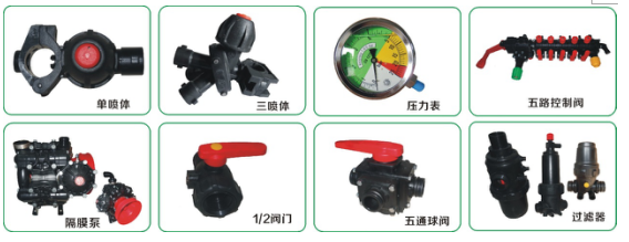 喷雾控制系统:喷雾控制系统主要由球阀、调压阀、分配器、过滤器、搅拌器、喷头、压力表、PVC管、胶管等组成,其主要用来控制喷雾量、喷雾压力、加水、加药、搅拌、清洗等。具体操作详见作业前与作业过程中的调整。